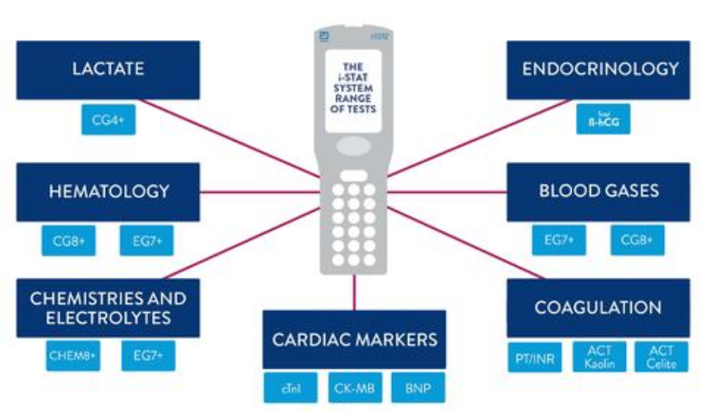 i-STAT System床旁血液監(jiān)護(hù)系統(tǒng)可以幫助臨床醫(yī)生快速多方面了解病人情況,肺/呼吸系統(tǒng):血氣,腎臟:肌酐、尿素氮,心?。杭♀}蛋白I、B型利鈉肽,體液平衡狀況:血氣+電解質(zhì)+乳酸,糖代謝:血糖的檢測,血液:紅細(xì)胞壓積、血色素,凝血功能:凝血酶原時間-國際標(biāo)準(zhǔn)化比值、活化凝血時間。是一個快速、多方面、動態(tài)的網(wǎng)絡(luò)化病情的監(jiān)護(hù)平臺,可以即時獲得準(zhǔn)確檢測結(jié)果。
