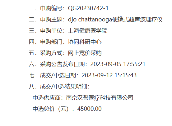 南京漢譽醫(yī)療近期就以DJO便攜式超聲波理療儀中標了上海健康醫(yī)學院的便攜式超聲波理療儀招標采購項目。